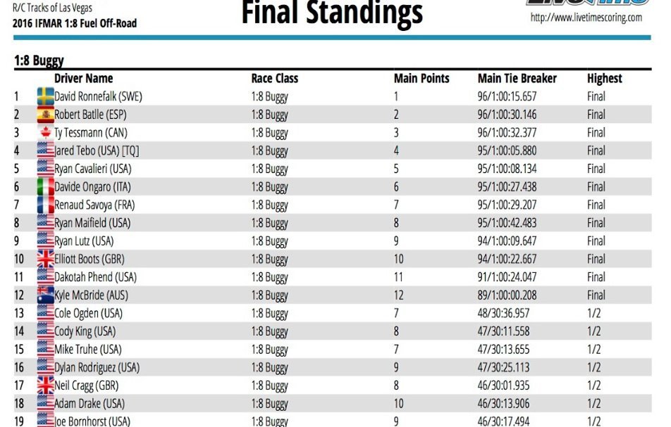 Швед Дэвид Ронефалк (David Ronnefalk) лидировал не во всех гонках, однако финальный заезд стал для него счастливым и принес желанное чемпионство. В течение последнего часа соревнований он быстро пробился в лидеры, когда его надежный багги D815 V2 (HB Racing) просто исчез в ночи на трассе Лас-Вегаса, оставляя соперников далеко позади. Остался позади и бывший обладатель титула Роберт Батл (Robert Batlle) и его сотоварищи по команде. В конечном итоге Роберт Батл (Испания) пришел вторым, а третье место досталось Ти Тиссману (Ty Tessmann) из Канады.