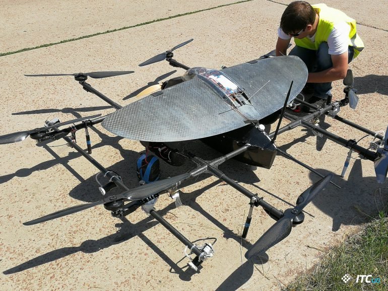 Kray Technologies – беспилотник с вертикальным взлетом. Взлет/посадку обеспечивают восемь винтов, а летает аппарат со скоростью до 110 км/час, благодаря широкому крылу и тяговому винту.