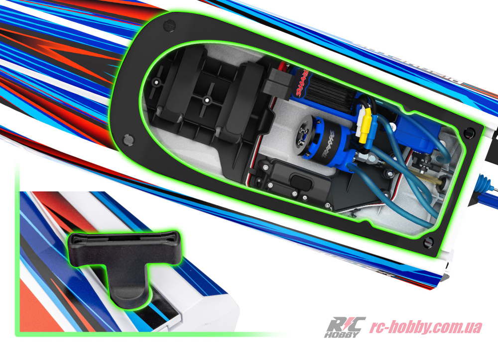 • Стабільність на воді – система Traxxas Stability Management (TSM) допомагає контролювати судно під час руху, мінімізуючи ризик перевертання та забезпечуючи плавні маневри.