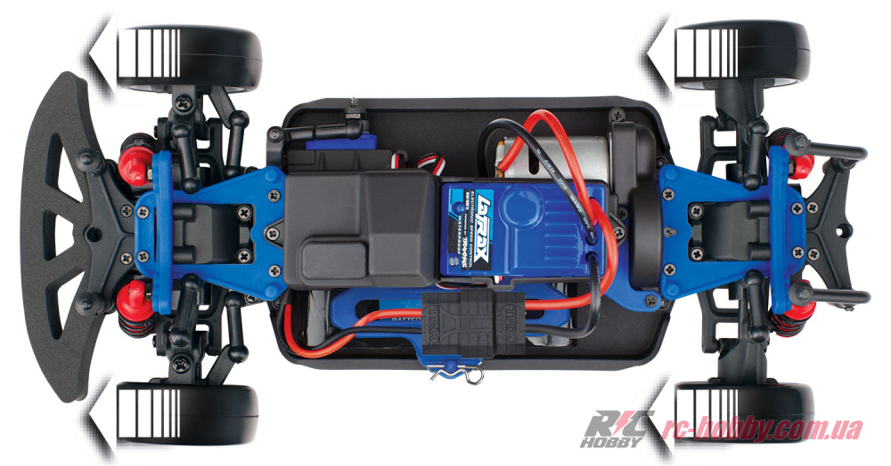 Одношвидкісна трансмісія з передатним числом 2,5:1 (шестерні 14T/54T) і повний привід 4WD із колісною базою 165,3 мм забезпечують блискавичне прискорення й чіпке зчеплення на будь-якій поверхні.
