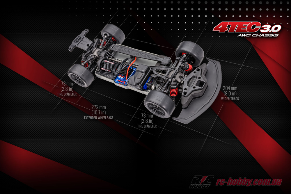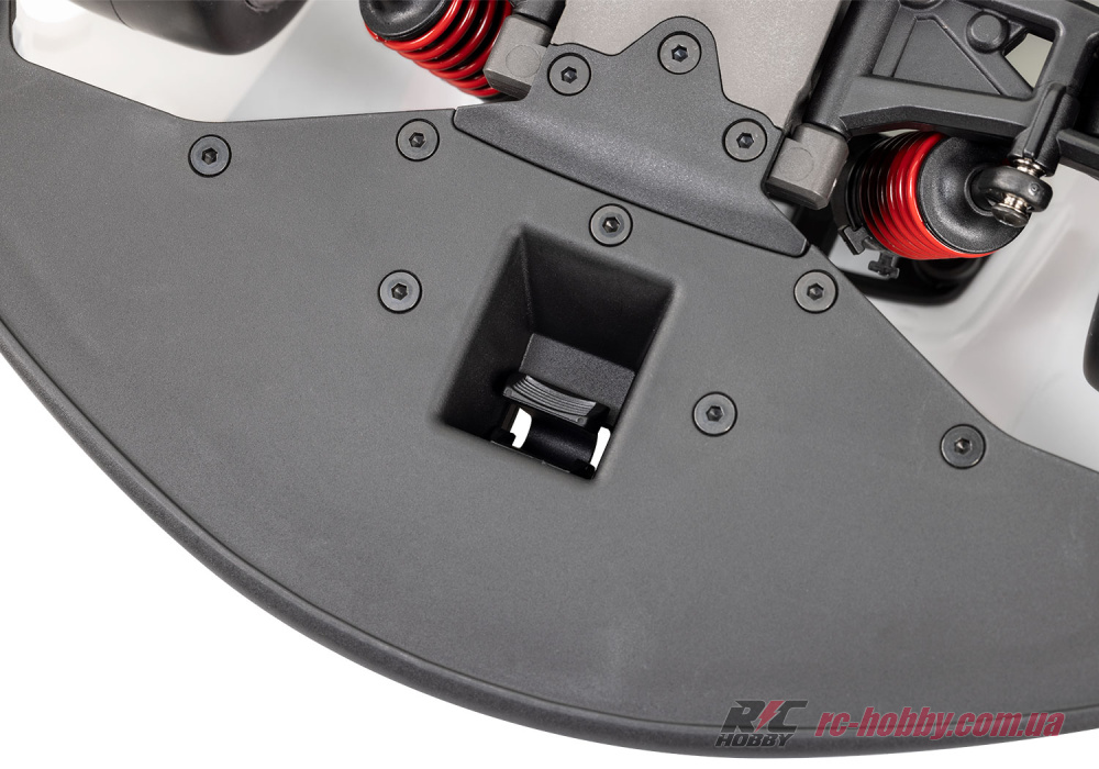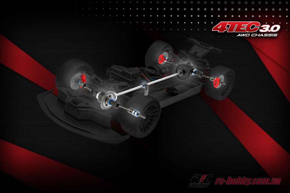 Одношвидкісна трансмісія з прямим приводом і передатним числом 11,38 забезпечує миттєвий відгук, а повний привід 4WD із колісною базою 272 мм гарантує ідеальне зчеплення на шосейних трасах.