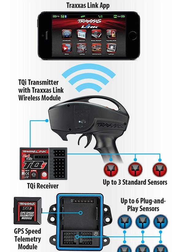 Для повної функціональності потрібен TQi-передавач, модуль Traxxas Link і TQi-приймач у моделі. Датчики телеметрії (наприклад, для температури чи швидкості) продаються окремо.