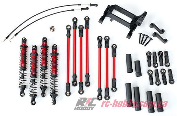 В комплекте 4 удлиненных, усиленных амортизатора, тяги подвески, наконечники тяг с шаровыми шарнирами, тросики, крепеж, рама.